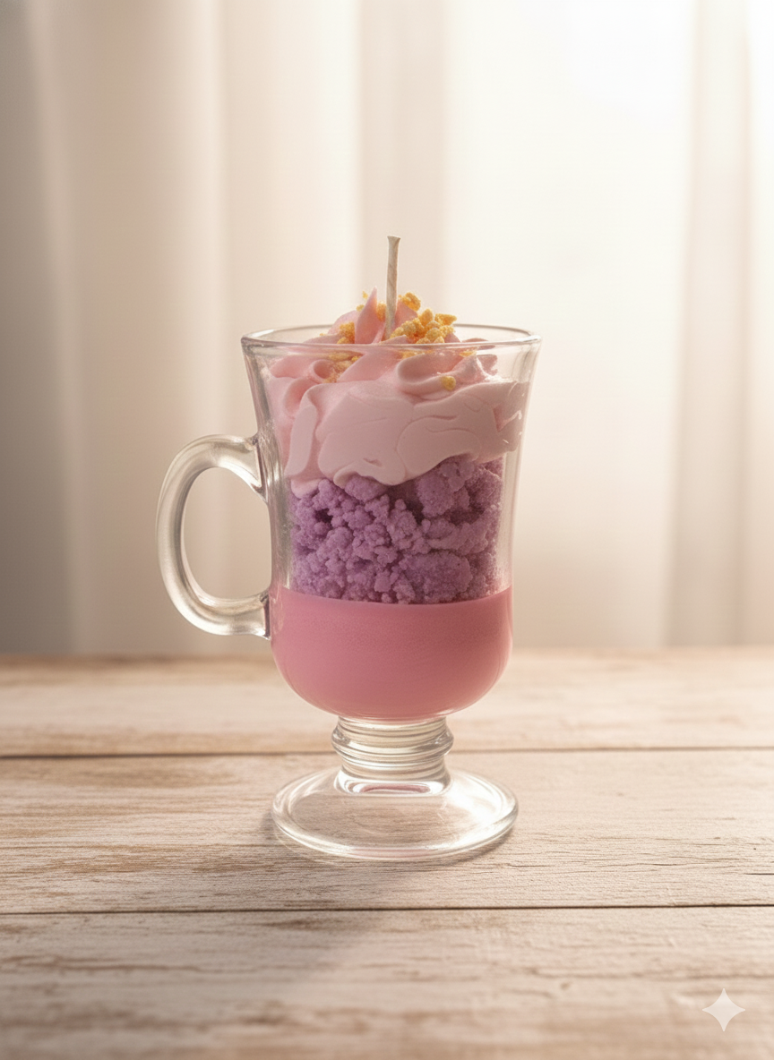 1 handcrafted aromatic candle made with natural soy wax, presented in an elegant cocktail-style glass. Its unique design mimics a desert with whipped cream and decorative details, adding a sweet and sophisticated touch to your space. Perfect for gifting or home decor.